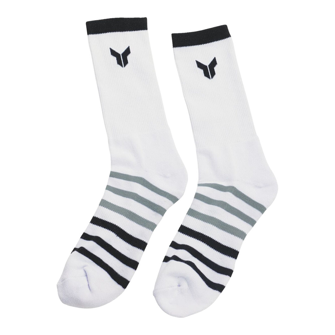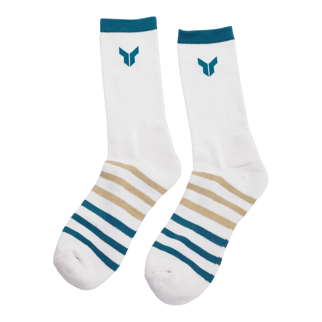 Crew duljina osigurava klasično pristajanje za svakodnevnu uporabu. Čarape su bijele s višebojnim prugama i logotipom.